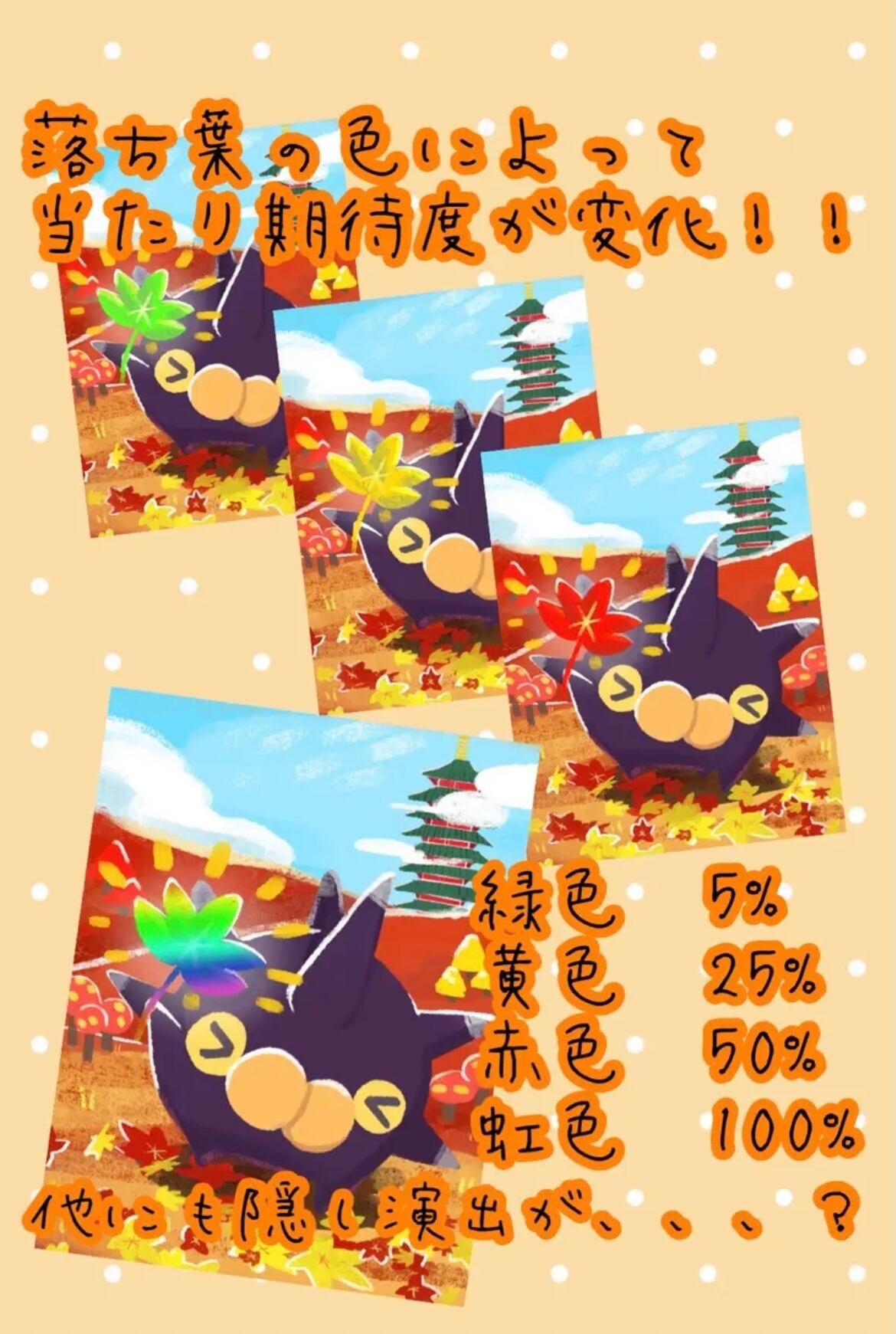 バチンウニが拾ってきた落ち葉の色で当たり期待度を示唆しています。